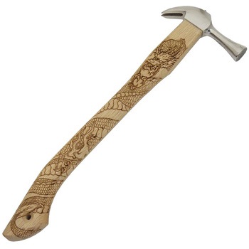 巻龍 ハンマー柄 450mm (天然木・樫) / 仕込み部 16x33mm:マルキン印オリジナルの真直ハンマー柄に巻龍の彫込焼付加工を施したインパクトのある木柄。持ち手部分は直線的な形状で、やや肉厚なしっかりとした握り心地。柄の末尾に曲線を施し、よりすっぽ抜けにくく視覚的にも洗練されたデザインに仕上げました。振り下ろす際に力が逃げにくく、手触りの良いなめらかな曲線が打ち疲れを軽減します。