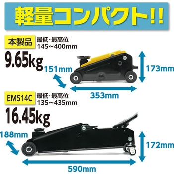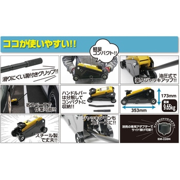 DIY派必見!軽くて使いやすいコンパクトジャッキでタイヤ交換がもっと手軽になるジャッキ登場!軽自動車・普通車にオススメの新型コンパクトジャッキその名も『ジャッキjr』後輪がキャスターから車輪になったことで、直進性がUP!支持台は別売アダプターに交換可能!!【EM226N 別売り】