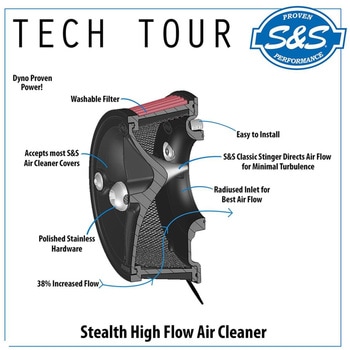 フィルター面積の拡大、R形状インレット、S&S独自のスティンガー形状により、よりスムーズで高速なエアフローをつくり出し、より高いパワーを発揮します。S&Sステルスエアクリーナーバックプレートは、自動車用インテークマニホールドや拳銃のボディに使用されている高強度合成樹脂で作られています。この素材は、優れた機械的特性、熱安定性、耐薬品性があります。吸入空気への熱伝達を低減し、より効率的な吸入ができるよう設計されています。