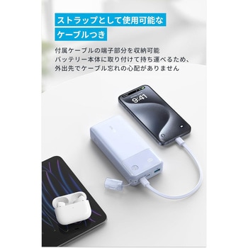ストラップとして使用可能なケーブルつき:同梱ケーブルを付属のストラップに収納可能です。バッテリー本体に取り付けて持ち運べるため、外出先でケーブル忘れの心配がありません