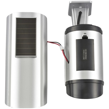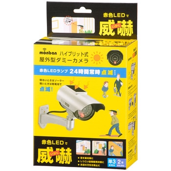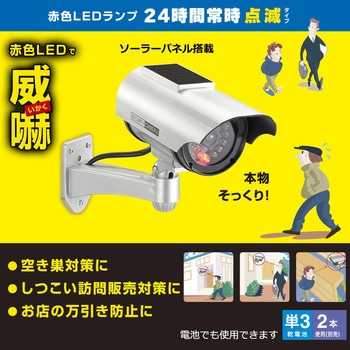 明るいときはソーラー、暗いときは乾電池で点滅24時間常にLEDランプが点滅するので、威嚇効果があります本物の防犯カメラそっくりのボディを採用電池式(暗いとき)と、ソーラー式(明るいとき)の機能を兼ね備えており、面倒な配線もなく、簡単に取り付けができる蛍光灯の光だけで電池なしでもLEDランプ点滅できるので、お店の万引き防止に最適空き巣対策に、しつこい訪問販売対策に、農作物の監視に、倉庫やガレージに「防犯カメラ作動中」のステッカー付き