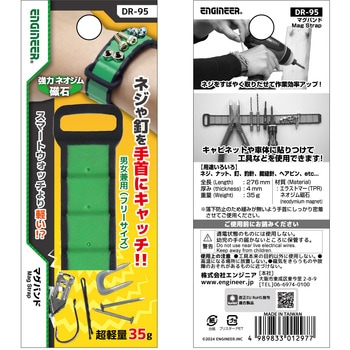 ネジや釘を手首に保持できるマグバンド。ネジなどを素早く取り出せて作業効率が向上。本体重量35gと軽量で、使用時の負担を軽減します。キャビネットや車体に貼り付けて、工具などを保持できます。水洗いできるので衛生的。