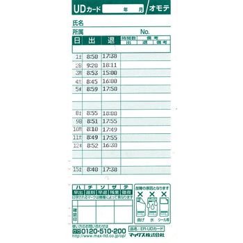 特記集計機能なし仕様徹夜勤務対応あり・サマータイムあり・休憩時間帯なし・シフトなし・【シンボルマーク】テ(徹夜)その他【使用人数】100人【使用カード】ER-Sカード、UDカード ※併用はできません【打刻回数】<出退2回><出退4回>付属品取扱説明書、設定確認カード1枚、壁掛け用ネジ2個※タイムカードは付属していません。適合【インクリボン】ER-IR103質量(kg)1.7色ホワイト電源(V)AC100 50/60Hz消費電力(W)待機時4.0 最大40寸法(高さH×幅W×奥行D)(mm)202×140×104精度水晶発振式 ±15秒/常温25℃(バックライト消灯時)表示部バックライト付LCD (常時点灯/常時消灯/操作・印刷後10秒後消灯設定可能)記録方式工場出荷時から停電累計3年間使用環境【温度】-5~40℃【湿度】10~80%(ただし結露なきこと)設定表示年月日・曜日・時刻・締め日は設定済み印字文字日付・曜日・時分内容量1台