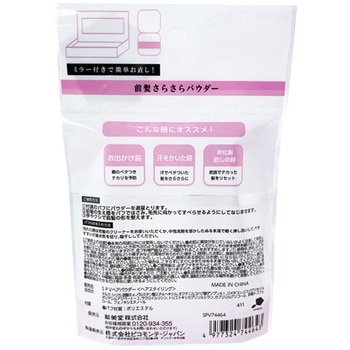 髪のベタつき瞬間さらさら!パフではさんでしっかり皮脂吸収!プレストタイプで簡単お直し!髪のうねり、ベタつきに。前髪を挟める仕様になっているパフなので、しっかり皮脂吸収できる!●持ち運びに便利なミラー付●パフもコンパクトの中に収納できる!原産国:中国