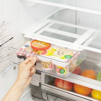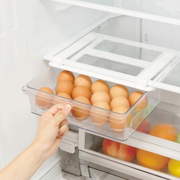 棚板に取り付けて棚下スペースを有効活用。卵やヨーグルト・プリンなどがサッと取り出せる引き出し式。卵トレーを外せば大容量の収納が可能。