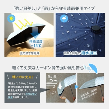 超軽量晴雨兼用傘!鞄に入れた事も忘れてしまう!軽量折りたたみ傘!体感温度-14度!暑い日差しの日には大活躍してくれます!カーボン骨で強度が高い!UVカット率99.9%!遮光率100%!紫外線保護指数UPF50+!雨傘と同等の撥水加工!コーティング加工ではないので気になる臭いもありません!軽さの秘密は新発想のラミネートフィルム圧着!