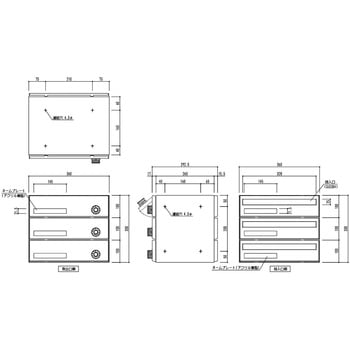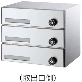 省スペース横型3戸分を体化して、施工時間を短縮しました。A4サイズの郵便物(210×297)も楽に投入できます。オートロックマンションに最適な前入後出タイプです。扉ストッパー付ですので片手で郵便物が取出せます。何段・何列でも取付スペースや必要数に応じた組合せができます。屋内仕様です。抜き取り防止プレート付
