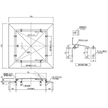 開口750角タイプ後付型 ガスダンパー付ストッパーにガスダンパーを使用していますので、安全な開閉が可能です。掛金物の固定には南京錠(別途)を必ずご使用下さい。溶接部は外面(研磨処理)、内面(スプレー処理)になります。