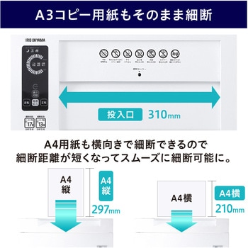 投入幅310mmでA3コピー用紙も細断可能。一度にA4コピー用紙を最大17枚細断60分連続稼働の高処理能力です。
