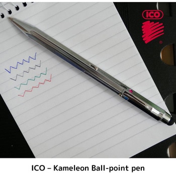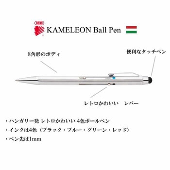 ハンガリーの文房具メーカーICOの『4色ボールペン カメレオン』です。シックなシルバーボディは鉛筆のような8角形。カラーを変える度に「カチャ」と音が鳴るおもちゃ感がレトロでかわいいです。持ち運びに便利なクリップ付き。ペンのあたまにはタッチペンも付いている優れものです。ペン先は1mm。インクカラーは4色(ブラック・ブルー・グリーン・レッド)。どこかレトロでかわいいデザインの「カメレオン ボールペン」はプレゼントにも最適です。
