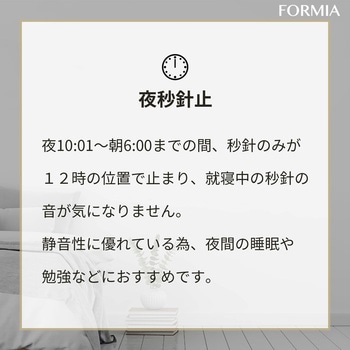 常に正確さと安心感をお届け。手間いらず、毎日の頼もしい味方。電波時計は標準電波を受信し、時刻を自動補正します。このため、常に正確な時刻を示すため、電池を交換するまで放置しておけます。電池を交換する際は、受信ボタンを押して放置すると、自動的に現在の時刻に合わせてくれます。質の高い睡眠を。気になる秒針を自動制御。22時1分から6時までの間、秒針のみが12時の位置で止まり、就寝中の秒針の音が気になりません。静音性に優れている為、夜間の睡眠や勉強などにおすすめです。