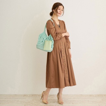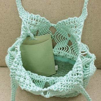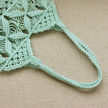 マクラメの幾何学風の編み模様がポイント。編みの透け感が春夏にピッタリ!爽やかな印象のトートバッグです。