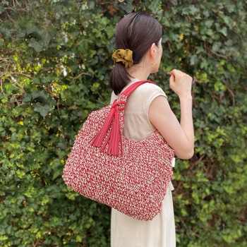 夏の季節にぴったりな素材感。2色の編地を使用し、きれいめなデザインにしました。取り外し可能な底板入りで型崩れ防止になります。大きめのタッセルがワンポイントアクセントです。