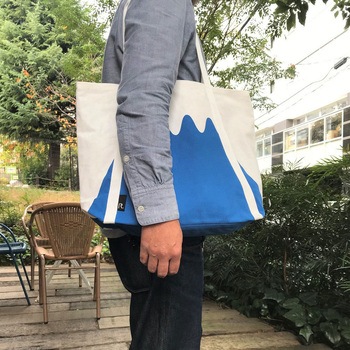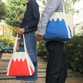 日本の象徴「富士山」がモチーフのトートバッグ。トートバッグ内側の調整ベルトを留めれば富士山のカタチが出来上がります。赤富士バージョンもあります。