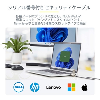 優れた互換性:HP、Dell、Microsoftなど幅広いノートPCに対応する盗難防止用ワイヤーケーブル。ブランドを問わず、業界標準のセキュリティースロットに対応し長期にわたって使用できる互換性を提供。オフィスや研究室の装置など、PC以外の盗難防止にも利用可能