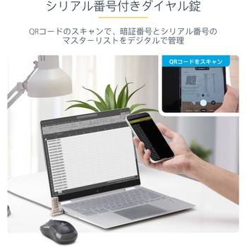 シリアル番号付きセキュリティワイヤー:各ロックには、シリアル番号に4桁の暗証コードが連動し、付属のQRコードシートに暗証番号を記録して、簡単に機器管理が可能。 リクエストに応じて、暗証番号の復元も可能