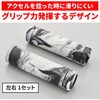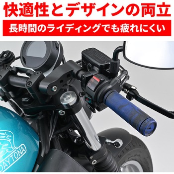 滑りにくく疲れにくいデイトナのオリジナルグリップ。アクセルを握ったとき滑りにくい表面パターンと、グリップ力に優れる素材を組み合わせて、長時間のライディングでも疲れにくいグリップに仕上げました。レザー調に見えるシボタイプのツバを無くし、クローズドエンド化したクルーザー向けモデル。マーブルの模様は、1本ずつ全て異なります。