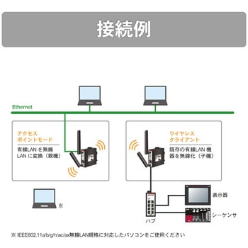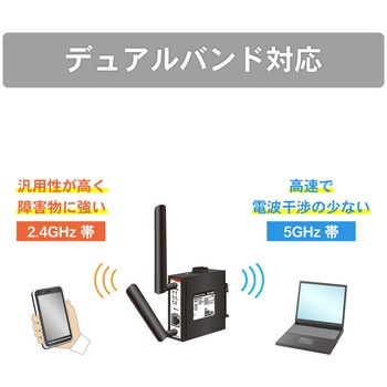 その他ユーティリティソフトウェア:設定ユーティリティ(Webブラウザからアクセス)取付方式DINレール取り付け保護構造IP30消費電力(W)11.6電源PoE給電(IEEE802.3af準拠)または電源端子(DC12-36V)外形寸法(幅W×奥行D×高さH)(mm)26.0×95.0×95.0(アンテナ部及び突起部含まず)機能冗長電源入力:対応アンテナ無指向デュアルバンドアンテナ2本(2.4GHz:2.07dBi 5GHz:2.66dBi)RoHS指令(10物質対応)対応通信規格ワイヤレス:IEEE802.11 a/b/g/n/ac/ax、イーサネット:IEEE802.3 /u/ab/x伝送速度(MAX)2.4GHz:574Mbps 11ax時、(MAX)5GHz:2400Mbps 11ax時、(MAX)イーサネット:1000bps通信ポート所有ポート:RJ-45×1ポート(PoE対応)動作温度範囲(℃)-20~65電波周波数2.4GHz、5GHz(5GHz帯を使用する場合、5.2GHz、5.3GHz帯域の電波の屋外での使用は電波法により禁じられています。また5.3GHz、5.6GHz帯域の電波を使用する場合は気象レーダーなどの干渉を避けるためのDFS機能により一時的に通信が途切れる可能性があります。)内容量1台
