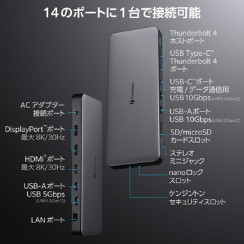 14ポートをこの1台に。据え置き型でパソコンの機能を大幅に拡張できるドッキングステーションです。Thunderbolt 4ケーブルが付属し、最大96W給電でノートパソコンへの高速充電が可能。最大40Gbpsの転送速度を提供しながら、映像を最大8K/30Hzまで出力します。あらゆる周辺機器への接続をケーブル1本で行えます。