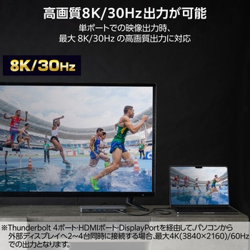 Thunderbolt 4ポートに接続して映像を最大8K/30Hzで出力可能です。 ※シングル(単ポートでの映像出力)の場合