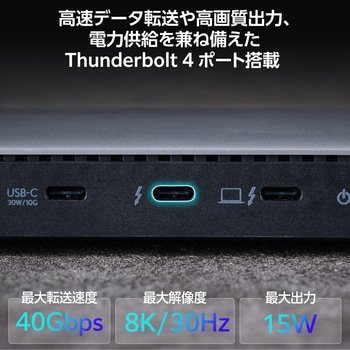 Thunderbolt 4ポート(ダウンストリーム)を1ポート搭載しています。供給電力値は15W(5V/3A)、対応解像度は最大8K/30Hzです。