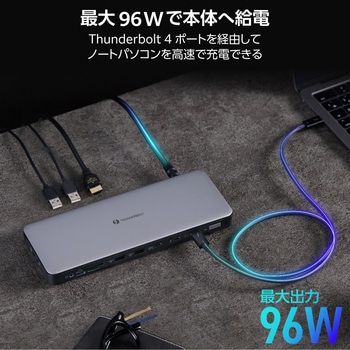 Thunderbolt 4ポート(アップストリーム)を経由して最大96Wの出力が可能。ノートパソコンを高速充電できます。