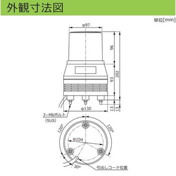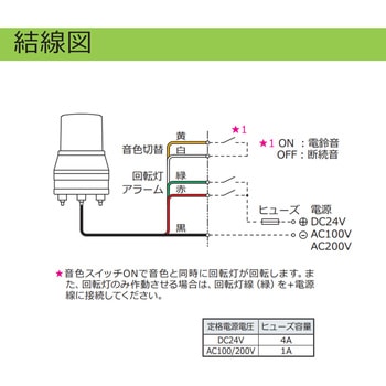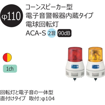 Φ110、直付けタイプ、電子音、回転灯と電子音の一体型 コンパクト設計ながら光と音で確実に情報伝達ができる、ハイブリッド電球回転灯です。光と音を個別に電源制御できます。最大音量90dBで、全方向に吹鳴します。(内蔵音量調節で、最小0dB ~最大90dBまで調節可能)電鈴音を内蔵しており、連続音、もしくは断続音をリード線の切り替えで選択できます。グローブは衝撃に強いポリカーボネート樹脂を採用しています。予備の電球を1個付属しています。保護特性IP53(正方向取付け時)です。