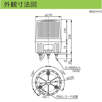 Φ170、直付けタイプ、点滅 / 点灯、超高輝度LED使用。独自の反射構造を採用しているので、側面方向からだけでなく、上方向からの視認性も優れています。点滅速度を本体で簡単に調節できます。本体内蔵のディップスイッチで、点灯または点滅動作の切り替えが可能です。保護特性IP23(正方向取付け時)です。