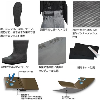 軽量で通気性に優れた70Dデニール生地。 通気性が良く着脱も容易なインナーメッシュ仕様。 耐久性のあるPVCブーツ。