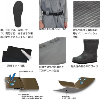 軽量で通気性に優れた70Dデニール生地 通気性が良く着脱も容易なインナーメッシュ仕様 。耐久性のあるPVCブーツ。