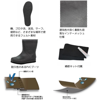 軽量で通気性に優れた70Dデニール生地 。通気性が良く着脱も容易なインナーメッシュ仕様。 耐久性のあるPVCブーツ。
