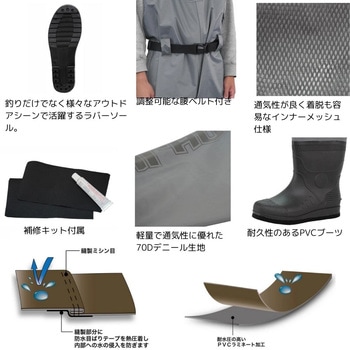 軽量で通気性に優れた70Dデニール生地 。通気性が良く着脱も容易なインナーメッシュ仕様。 耐久性のあるPVCブーツ。