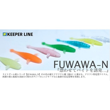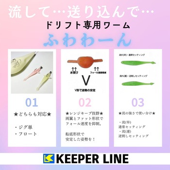ライトゲームシリーズ第四弾、ドリフト専用アイテム「ふわわーん」。くにゃーんシリーズと違うコンセプトで開発を進めた今回のアイテムは、より長時間一定のレンジを漂わせることができるのかを追求し開発。ファットな形状と両側に突出した翼で下方向への力を抑制させ、抜群のレンジキープ力を実現させました。船底をイメージさせたV型のボディ形状で水中での綺麗な姿勢を持続。流れが無い状況では逆付けセッティングで、さらにレンジキープ力を向上させます。潮止まりのルアーを追いかけにくい状況や、消波ブロック帯で居喰いするメバルにも抜群の効果を発揮します。