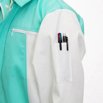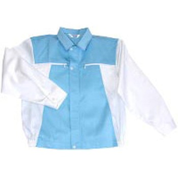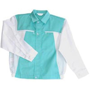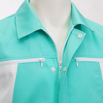 清涼感のあるクール色が白に映える。前ファスナー(比翼ドット)、両脇ゴム、袖口ドット、後ろタック