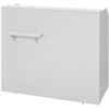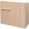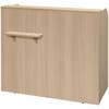 テンポシリーズ レジカウンター。本体上部には小天板があり、キャッシュレス決済端末やQRパネルなどを設置できます。小天板は内向き・外向きのどちらにも取り付け可能です。天板下には鍵付き引出しを備え、天板と棚板の左右両側に配線用の切り欠きがあります。収納スペースも充実しており、固定棚2枚と可動棚2枚(64mmピッチで高さ調整可能)が付属。お客様側には手荷物台を備えます。レジカウンター単体でも使用できるほか、ハイカウンターと並べることで一体感のあるレイアウトも可能です。鍵付き