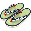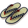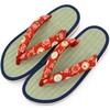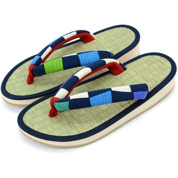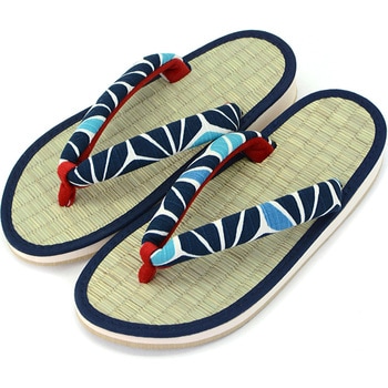 日本製のレディース畳雪駄。近代的なスニーカー型で小指がこぼれずに履きやすい。ポップな柄の鼻緒を特徴。底は柔らかなスポンジ底で、室内でも履けます。天然のタタミ(い草)雪駄は通気性があり蒸れにくく快適です。い草には保温、温度調整、吸音といった機能があり、足の裏に熱がたまらず、汗をかいても足元は快適です。表皮は常にサラッとしているため、触れた時に心地よい冷たさがあります。