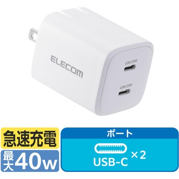 色ホワイト質量(g)約110使用温度範囲(℃)0~25規格◇PSE 特定電気用品コネクタ形状USB Type-Cポート×2定格入力電圧(V)AC100~240(50/60Hz)対応機種各USB Type-C(TM)ポートからUSB Power Delivery 40WおよびPPS(Programmable Power Supply)33Wの規格内で充電が可能なノートパソコン、スマートフォンなどの機器。2ポート同時接続時、合計最大40Wまでの出力で充電・給電可能な機器とその組み合わせ。外形寸法(幅W×奥行D×高さH)(mm)約47×37×37定格出力電圧[単独接続時]USB Type-C1ポート/USB Type-C2ポート:5V/9V/15V/20V、PPS出力5~11V、[2ポート同時接続時]USB Type-C1ポート/USB Type-C2ポート:5V/9V定格入力電流(A)1.5保証期間1年間定格出力電力(W)単独接続時:USB Type-C1ポート/USB Type-C2ポート最大出力40・PPS最大出力33・2ポート同時接続時:合計最大出力40・USB Type-C1ポート/USB Type-C2ポート最大出力20プラグタイプ90度スイング構造定格出力電流[単独接続時]USB Type-C1ポート/USB Type-C2ポート:5V/9V時3A、15V時2.67A、20V時2A、PPS出力5~11V時3A、[2ポート同時接続時]USB Type-C1ポート/USB Type-C2ポート:5V時3A、9V時2.22A内容量1個