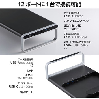 セット内容USB Type-Cケーブル(規格:USB 10Gbps、約70cm ※コネクター含まず)×1本 、ACアダプター×1個、ACケーブル×1本質量(kg)スタンド本体:約2、ACアダプター:約0.82色グレー備考※各OSの最新バージョンへのアップデートや、サービスパックのインストールが必要になる場合があります。耐荷重(kg)約10※本製品に設置するモニターのサイズは最大27インチまで対応OSWindows 11/10、macOS Sequoia15/macOS Sonoma 14、iPadOS 18/17、macOS Sequoia15/macOS Sonoma 14、iPadOS 18/17外形寸法(幅W×奥行D×高さH)(mm)約540×210×87動作環境温度5~40℃、湿度30~80% ※結露なきこと保証期間1年間電源供給方式セルフパワーUSBポート数【ダウンストリーム(1)】USB Type-Cポート<USB>×2 ※1ポート30W、2ポート合計60WまでのUSB Power Deliveryに対応。映像出力には対応していません、【ダウンストリーム(2)】USB-Aポート<USB>×1 ※供給電力値最大7.5W(5V/1.5A)、【ダウンストリーム(3)】USB-Aポート<USB>×2 ※供給電力値最大4.5W(5V/0.9A)(データ通信専用)、【ダウンストリーム(4)】USB-Aポート<USB>×1 ※供給電力値最大2.5W(5V/0.5A)(データ通信専用)コネクタ仕様【アップストリーム】USB Type-C(TM)ポート<USB>、USB Power Delivery対応(最大出力100W ※ただしダウンストリームのUSB Type-Cポート使用時は最大出力65W)、DisplayPort(TM) Alt mode (USB2.0接続時はUSB2.0互換で動作(USB2.0時は映像出力非対応))ポート【映像出力/ダウンストリーム】HDMI(R)×1<対応解像度:最大4K/60Hz>、【音声/ダウンストリーム】Φ3.5mm4極ステレオミニジャック×1(CTIA方式)LAN【ポート(ダウンストリーム)】RJ-45ポート×1(最大1000BASE-T/100BASE-TX/10BASE-T)カードリーダー【ダウンストリーム(1)】SDカードスロット×1・対応メディア:SD・SDHC・SDXC、【ダウンストリーム(2)】microSDカードスロット×1・対応メディア:microSD・microSDHC・microSDXC内容量1個