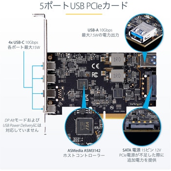 オプションの電源:マザーボードの電力が不足している場合、USBポートへ追加電力を供給するSATA電源対応のUSB PCIe拡張カード。USB Type-Cポートごとに最大5V 3A(15W)、USB Type-Aポートでは最大5V 1.5A(7.5W)を供給