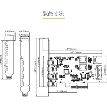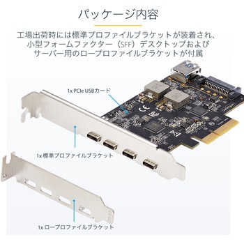 標準およびロープロファイルブラケット:標準プロファイルブラケット装着済みのPCIエクスプレスUSB拡張カード。薄型(SFF)デスクトップPCやサーバーに対応するロープロファイルブラケット付属
