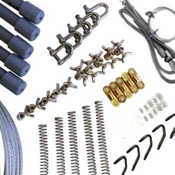 各部品をばら売りで購入しようとすると、選定が大変で値段も高くなってしまいますが、こちらの商品はまとめ買いできますので、費用をおさえて簡単に自作組立したい方におすすめです。【内容物】・ワイヤロープ 4mm(6×19) 2m ×10本 +予備1本・抜け防止金具 ×5個・より戻し(サルカン) ×5個・シャックル ×5個・蝶ねじシングル ×5個・蝶ねじダブル ×5個・アルミクランプ管 ×20個+予備1個・塩ビ管 ×5組・スプリング (ステンレス製)×5本