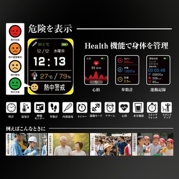 熱中症リスクを「見える化」USB 充電式。熱中症警戒アラート搭載!温度・湿度・時間帯に加え、体温データや心拍数変動も考慮し、熱中症の前兆症状に対応して「熱中警戒」「熱中厳重警戒」などのアラートを自動表示します。また体温の上昇を察知し、「注意」「警戒」などの表示とアラート音、振動で熱中症のリスクを通知します。履歴なども確認できます。