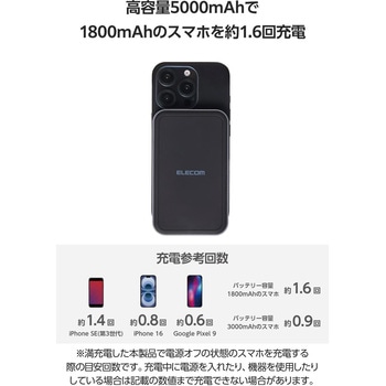 本製品(バッテリー容量5000mAh)で、1800mAhのスマートフォンを約1.6回、3000mAhのスマートフォンを約0.9回充電可能です。