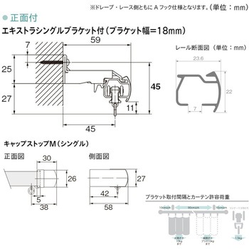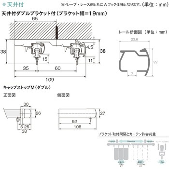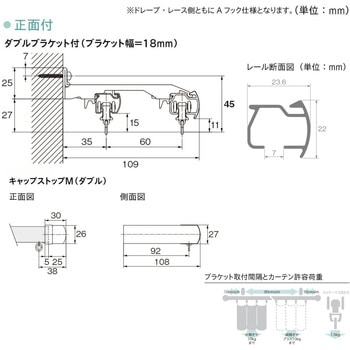 材質レール(アルミニウム合金押出形材、オレフィン系樹脂皮膜フィルムラッピング)、キャップ(ABS樹脂、天然木)、ブラケット(本体:スチール、ツメ:アセタール樹脂)、ランナー(プレート:硬質ポリエチレン、ホイール:ポリエステルエラストマー、ダエンリング:ステンレス)