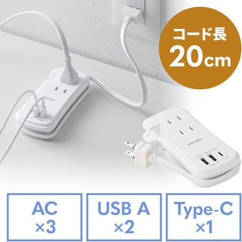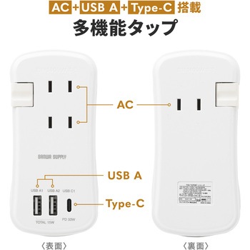 3個口のACコンセントに加え、USB Type-Cポートを1ポート、USB-Aポートを2ポート搭載した多機能タップです。