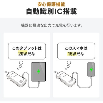 USB Type-Cポートには自動識別ICを搭載しており、スマートフォンなどの機器に最適な出力で充電を行います。