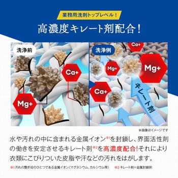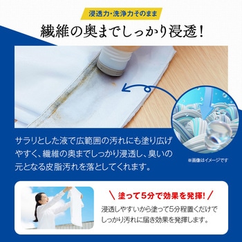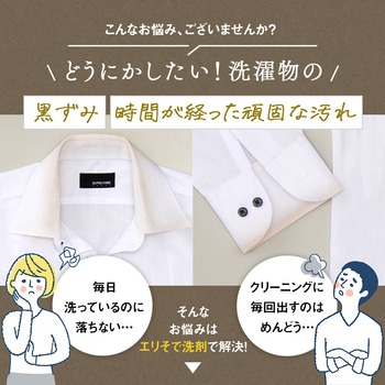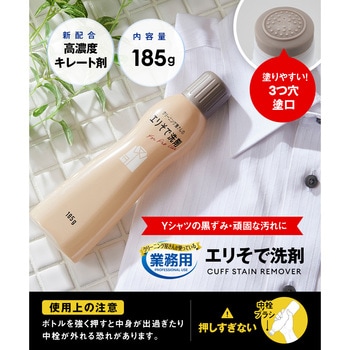 クリーニング業界で使われている業務用のエリそで洗剤です。新配合の高濃度キレート剤が界面活性剤の働きを安定させ、皮脂や汗などの頑固な汚れをしっかりはがします。幅広の塗り口で塗りやすく、5分ほどで汚れの奥まで浸透。臭いや黒ずみの元を分解し、頑固な汚れもスッキリ落とします。手早く簡単に汚れが落とせるから、洗濯時間を短縮できます。ランドリールームになじむ、おしゃれなパッケージです。