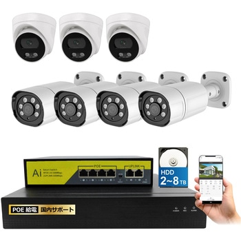400万画素PoEタイプNVR防犯カメラセット バレットカメラ4台 ドームカメラ3台、HDD2TB付き