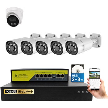 400万画素(4M)パレット型、500万画素(5M)ドーム型の高画素対応LANケーブル経由で電気を供給するので、電源を取れない場所にもカメラを設置できる配線がすっきりする(省配線)専用アプリと接続することで、外出先からスマホで映像を確認することができる赤外線LED搭載の高画素画素カメラで、夜間でも撮影が可能(モノクロ撮影)録画機はサイクル録画機能で常に最新データをハードディスクに保存
