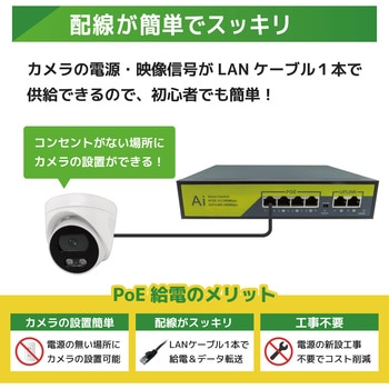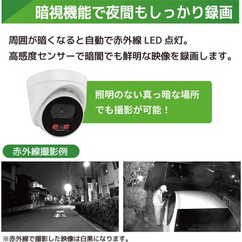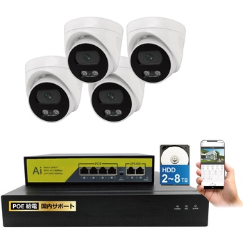 800万画素(4k)の高画素対応LANケーブル経由で電気を供給するので、電源を取れない場所にもカメラを設置できる配線がすっきりする(省配線)専用アプリと接続することで、外出先からスマホで映像を確認することができる赤外線LED搭載の800万画素カメラで、夜間でも撮影が可能(モノクロ撮影)録画機はサイクル録画機能で常に最新データをハードディスクに保存